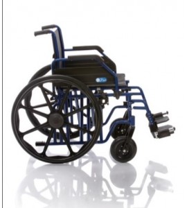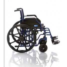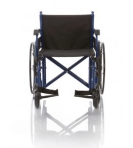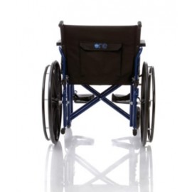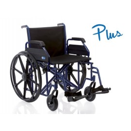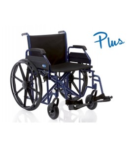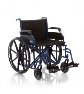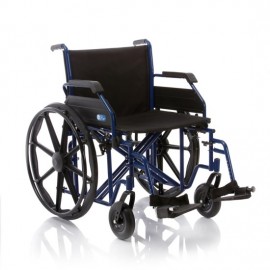 Telaio stabilizzante in acciaio verniciato DOPPIA crociera, seduta e schienale in nylon nero imbottito e lavabile, tasca portadocumenti sul retro. Ruote posteriori piene (Ø 60 cm), gomme nere in PU. Ruote anteriori nere in PU (Ø 20 cm – spessore 5 cm) con forcella in acciaio con fori per la regolazione della ruota. Braccioli corti estraibili con imbottitura in PU. Pedane estraibili regolabili in lunghezza con pedana in plastica nera e cinturino ferma-tallone.