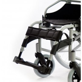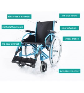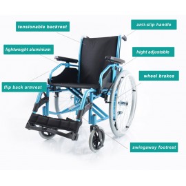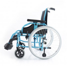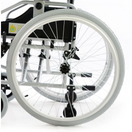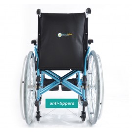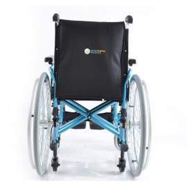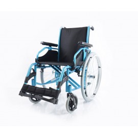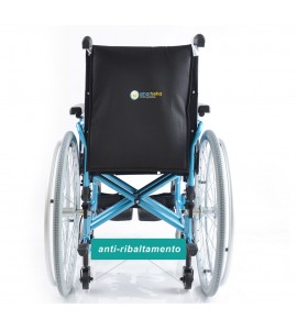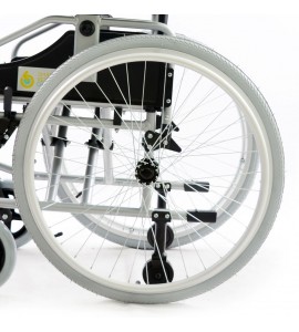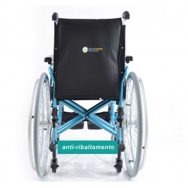 Sedia a rotelle per persone anziane e portatori di handicap, con telaio stabilizzante in alluminio verniciato DOPPIA crociera, seduta e schienale in nylon nero imbottito e lavabile, tasca porta documenti sul retro. Ruote posteriori in alluminio , gomme pneumatiche con corrimano in alluminio. Ruotini di sicurezza e ruotini antiribaltamento di serie. Ruote posteriori ad estrazione rapida, pneumatiche, da 24'' x 1-3/8'' (Ø 600mm), con corrimano in alluminio. Braccioli ribaltabili, estraibili, regolabili in altezza. Schienale in tessuto lavabile, rinforzato. Pedane indipendenti, estraibili e regolabili in altezza.