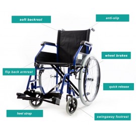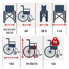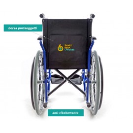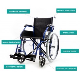 Carrozzina standard ad autospinta con telaio pieghevole stabilizzante, in acciaio verniciato. Disponibile nelle misure 40,43,46,48,50 che corrispondono alla larghezza della seduta in cm. Ruote anteriori: 8" in poliuretano. Piene. Ruote posteriori: 24" in poliuretano. Piene. Braccioli in plastica dura (più durevoli di quelli in ecopelle) , ribaltabili e completamente estraibili per facilitare i movimenti da sedia a carrozzina. Seduta e schienale imbottiti e rivestiti in nylon lavabile e di alta qualità. Poggiapiedi estraibili. Estrazione Rapida delle ruote posteriori. Con un solo click è possibile smontare le ruote posteriori per un facile trasporto. Pratica e maneggevole, si chiude facilmente per il trasporto in auto, perfetta anche per passaggi stretti. Comoda tasca portaoggetti sullo schienale.