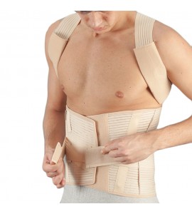 Realizzato in puro cotone di alta qualità, traspirante e antisudorazione, questo corsetto è dotato di bretelle che passando sotto alle braccia e chiudendosi sul petto offrono un maggiore supporto extra, nella zona lombare. Le due barre metalliche nella parte posteriore possono essere inclinate in base alla curvatura fisiologica della spina dorsale fornendo maggiore stabilità .Altezza frontale 32 cm.