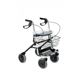 Freno con leva chiusa a due funzioni. Tirando la leva verso il basso l'utilizzatore aziona, in caso di necessità premendo verso il basso, il freno di emergenza o di stazionamentoper soste prolungate, mentre utilizzandola come il freno di una bicicletta è possibile frenare normalmente. Per disinserire il freno di emergenza occorre sbloccare la leva tirandola verso l'alto. Un dispositivo di sicurezza previene chiusure accidentali dell'ausilio. Ruote piroettanti in gomma piena, vassoio portaoggetti in plastica con dei perni a pressione che lo fissano al sedile, cestino portaoggetti in acciaio, asportabile con maniglia.