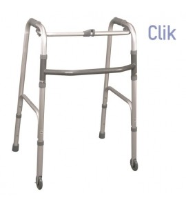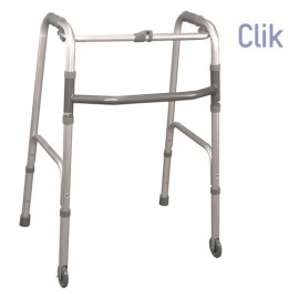 Deambulatore pieghevole costruito in alluminio anodizzato con manopole imbottite, dotato di due ruote fisse frontali e due gambe posteriori, puntali in gomma antiscivolo. Indicato per anziani, malati e persone disabili, in presenza di difficoltà motorie.