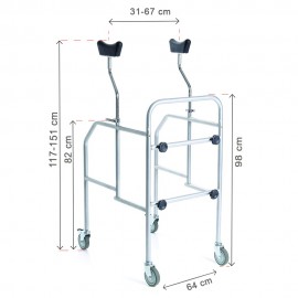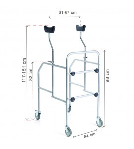 Questo deambulatore rollator è fornito di supporti sottoascellari regolabili in altezza, larghezza e profondità. I supporti ascellari sono regolabili in altezza da un minimo di altezza totale di 117 cm, fino ad un massimo di altezza totale di 151 cm. La distanza tra i due supporti ascellari e quindi la larghezza, può essere regolata da un minimo di 31 cm ad un massimo di 67 cm. In questo modo il deambulatore rollator è adattabile a tutti i tipi di corporatura ed estremamente personalizzabile. I sottoascellari sono in morbido polipropilene, materiale che garantisce il massimo comfort all'utilizzatore.