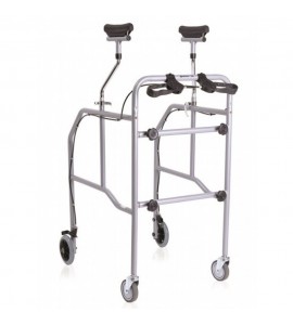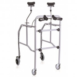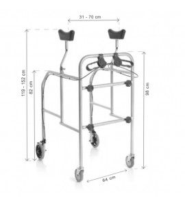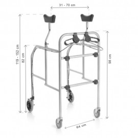 Deambulatore/girello con supporto sottoascellare realizzato per sostenere persone con difficoltà di movimento. Smontabile. In acciaio cromato. 4 ruote piroettanti di 10 cm di cui 2 con freni con comando frontale. Capacità massima 130KG. Sottoascellari in Polipropilene. Puntali gomma antiscivolo.