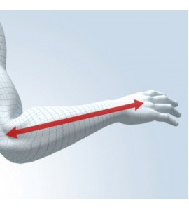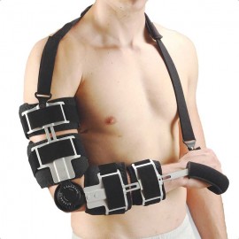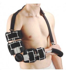 Ortesi anatomicamente progettata per adattarsi alla forma del gomito. Fabbricata in tessuto stratificato spugnoso con lato interno in tessuto di spugna. La regolazione dell'angolazione si effettua facilmente premendo un tasto. l'ortesi effettua la flessione e l'estensione controllata del gomito. Regolazione della flessione possibile a (0-15-30-45-60-75-90-105) gradi. Regolazione dell'estensione possibile a (-15-0-15-30-45-60-75-90) gradi. Il supporto in alluminio permette di regolare la lunghezza e impedisce la caduta del polso. La cinghia per la spalla offre comodità nell'utilizzo.