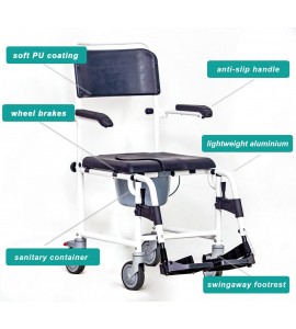 La carrozzina da doccia Wave è una innovativa carrozzina per l'utilizzo sia come sedia da doccia che come comoda, nonché per i piccoli spostamenti all'interno dell'abitazione. Il telaio è interamente realizzato in alluminio trattato con vernice epossidica per una completa protezione da agenti esterni.