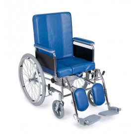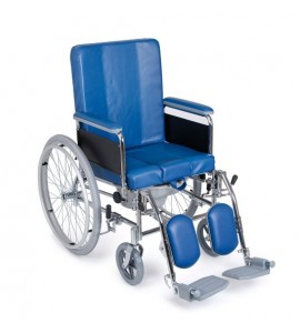 Sedia comoda con struttura in acciaio cromato. Sedile anatomico imbottito. Braccioli estraibili. Pedane estraibili lateralmente e regolabili in altezza. Poggiapiedi regolabili in lunghezza e ribaltabili. Wc in materiale plastico facilmente lavabile. Schienale anatomico reclinabile, estraibile, alto 54 cm. Rivestimento in similpelle, facilmente lavabile.