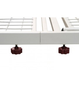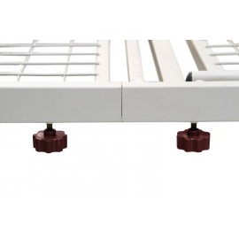 Struttura in tubolare di acciaio verniciato a polveri con piano in rete di acciaio elettrosaldato sul perimetro. Testiera, pediera e sponde in legno. Alzatesta (70°) e alzagambe (30°) regolabili in altezza tramite attuatori elettrici collegati al telecomando. Supporti per asta sollevamalati ed asta da flebo (opzionali).