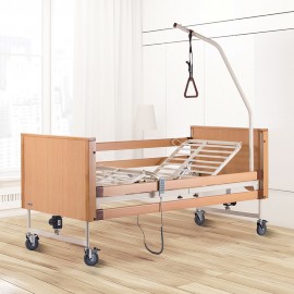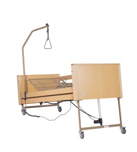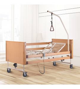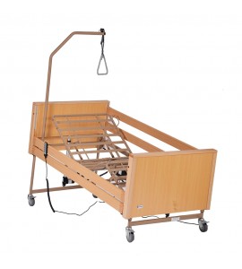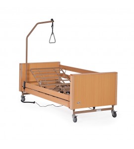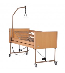 Letto ortopedico in legno di faggio ad altezza variabile totalmente elettrico. 4 ruote frenanti, motore 5 funzioni. In dotazione asta solleva malato. Struttura portante in tubolare d'acciaio verniciato, piano rete in acciaio verniciato con movimentazione sez. testa, gambe e piedi, ed altezza variabile tramite base elettrica con motori elettrici (24V-DC). Predisposizione per asta solleva malato ed asta portaflebo. Dotato di 4 ruote piroettanti di cui 2 frenanti. Telecomando dotato di dispositivo Nurse Lock che permette l'attivazione di alcune funzioni solo da parte di personale autorizzato.