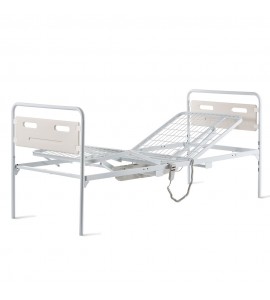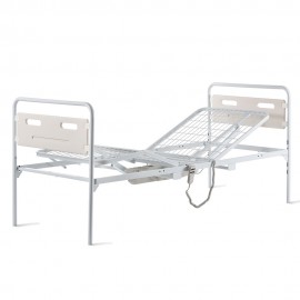 Letto elettrico da degenza a 3 snodi e 4 sezioni predisposto per asta alzamalato e asta portaflebo. Sezione testa, gambe e piedi regolabile a mezzo sistema elettrico dotato di telecomando. Letto in tubo di acciaio verniciato (polar white) ø40x20x1,5 mm a sezione rettangolare rinforzata con barra trasversale.