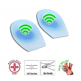 Dispositivo medico di Classe I. Realizzato in silicone vellutato al tatto di alta qualità, con funzione antishock e a doppia densità riconoscibile dall'area blu che sostiene il tallone. Sono fabbricate in silicone medicale ipoallergenico, indeformabile, di prima scelta e delicato sulla pelle. Il tocco vellutato conferisce una piacevole sensazione al tatto. La speciale struttura a doppia densità, scarica dal peso le zone di spina calcaneare.Riduce il dolore di piede e polpaccio.