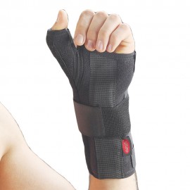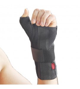 Fabbricato in neoprene, il supporto in alluminio sagomato e dal design anatomico immobilizza il polso e il pollice in posizione neutra.