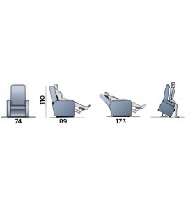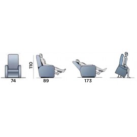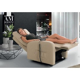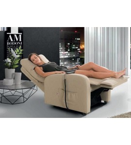 Pratica e comoda poltrona relax pensata per il benessere ed il rilassamento della persona. Design pensato per il massimo comfort, grazie alle varie posizioni di inclinazione si adatta alle più svariate esigenze. I due motori separati consentono di inclinare lo schienale e del poggiapiedi separatamente, consentendo così di ottenere più posizioni, da quella adatta per la lettura o la visione della televisione, a quella di rilassamento e/o digestione. La poltrona è inoltre dotata della funzione alzapersona, grazie ad un motore che consente il sollevamento della persona. Con questo dispositivo di sollevamento, la persona seduta è accompagnata fino ad una posizione quasi eretta, senza rischi di sforzi o affaticamenti, facilitando così l'alzata dalla poltrona anche a chi ha ridotta capacità motoria. Il movimento alzapersona è completamente sicuro, facile e non richiede alcuno sforzo da parte del fruitore. La regolazione delle varie posizioni dello schienale e del poggiapiedi avviene grazie ad un pratico telecomando dotato di pulsanti, facile da usare.