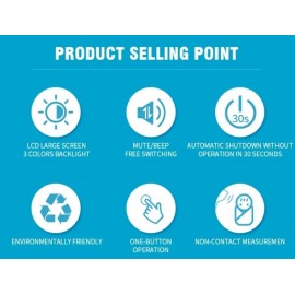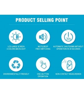 Sicuro e igienico. Allarme sonoro di intervallo temperatura (impostabile dall'utente). Schermo di controllo LCD a 3 colori, corrispondenti ai livelli di temperatura: verde normale, arancione febbre leggera, rosso febbre elevata. Unità di misura °C e °F selezionabili. Dispositivo per uso medicale. Batterie non incluse.