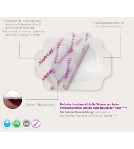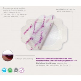 La tenuta istantanea evita la necessità di un fissaggio aggiuntivo - grazie a Safetac®, l'originale strato di contatto in silicone adesivo che riduce al minimo il dolore Con Safetac, è possibile rimuovere facilmente la medicazione senza danneggiare la cute.
