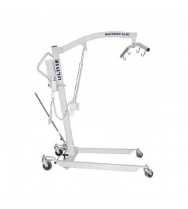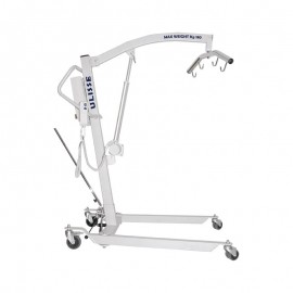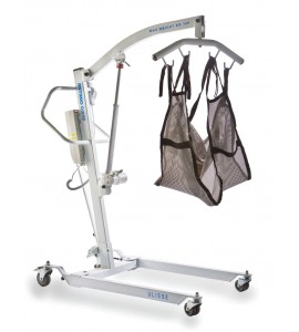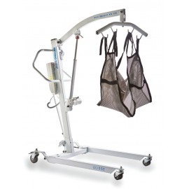 Sollevatore elettrico a base regolabile per malati. Portata kg.180. Struttura in tubo di acciaio a sezioni differenziate ad alta resistenza meccanica. Base a bracci mobili regolabili su tre posizioni a mezzo leva centrale, corredata da 4 ruote di cui 2 con freno indipendente.